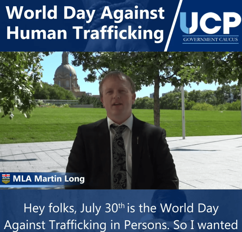 Posted Under: Martin Long 30 Jul 2020 Human trafficking is a heinous crime that preys upon the most vulnerable members of society. On this World Day Against Trafficking in Persons, Alberta recommits to eradicating human trafficking and supporting survivors.